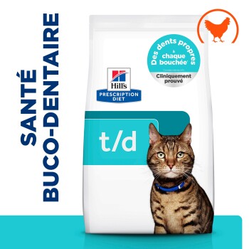La nourriture pour chat Hill's Prescription Diet t/d est une alimentation reconnue pour réduire la formation de plaque dentaire et du tartre et est recommandée par le Veterinary Oral Health Council (VOHC).
