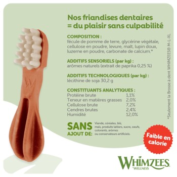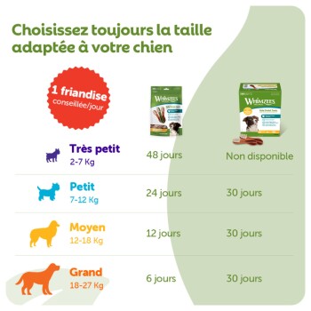 Cette taille a été spécialement conçue pour les chiens de races moyennes (12–18 kg). Ne convient pas aux chiens de moins de 9 mois. Nous recommandons un seul produit à mâcher par jour. Choisissez toujours la taille adaptée à votre chien et mettez-lui en permanence de l’eau fraîche à disposition. Aliment complémentaire pour chiens. Pour plus d’informations, veuillez vous adresser à : info@whimzees.com